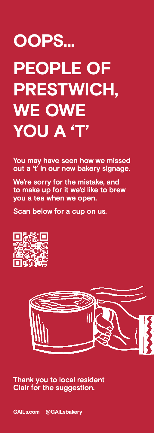 Bakery chain Gail’s is attempting to win over Prestwich after spelling mishap